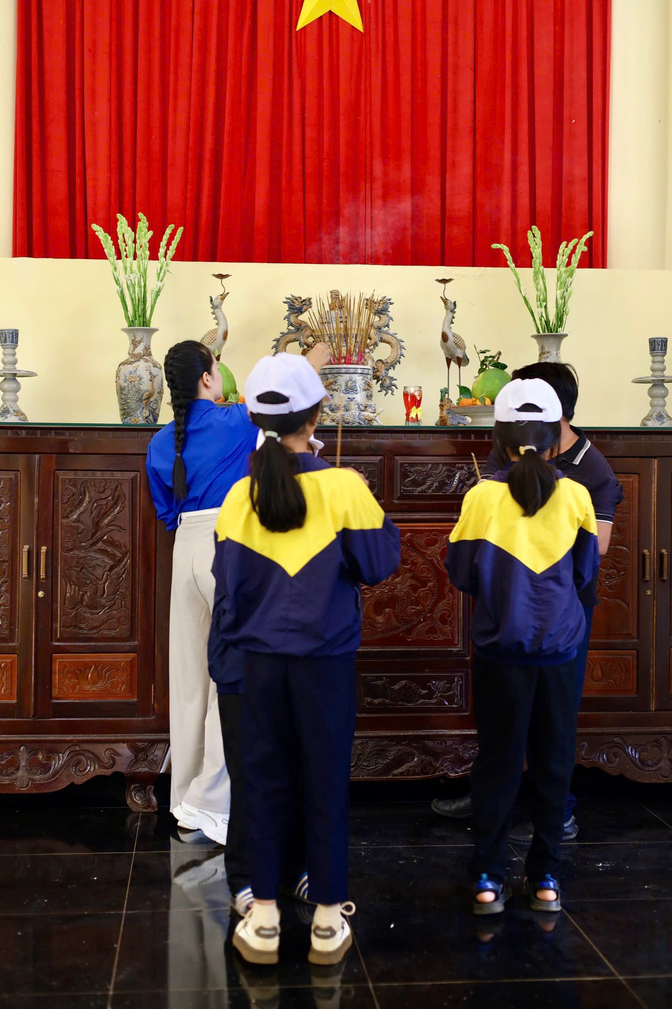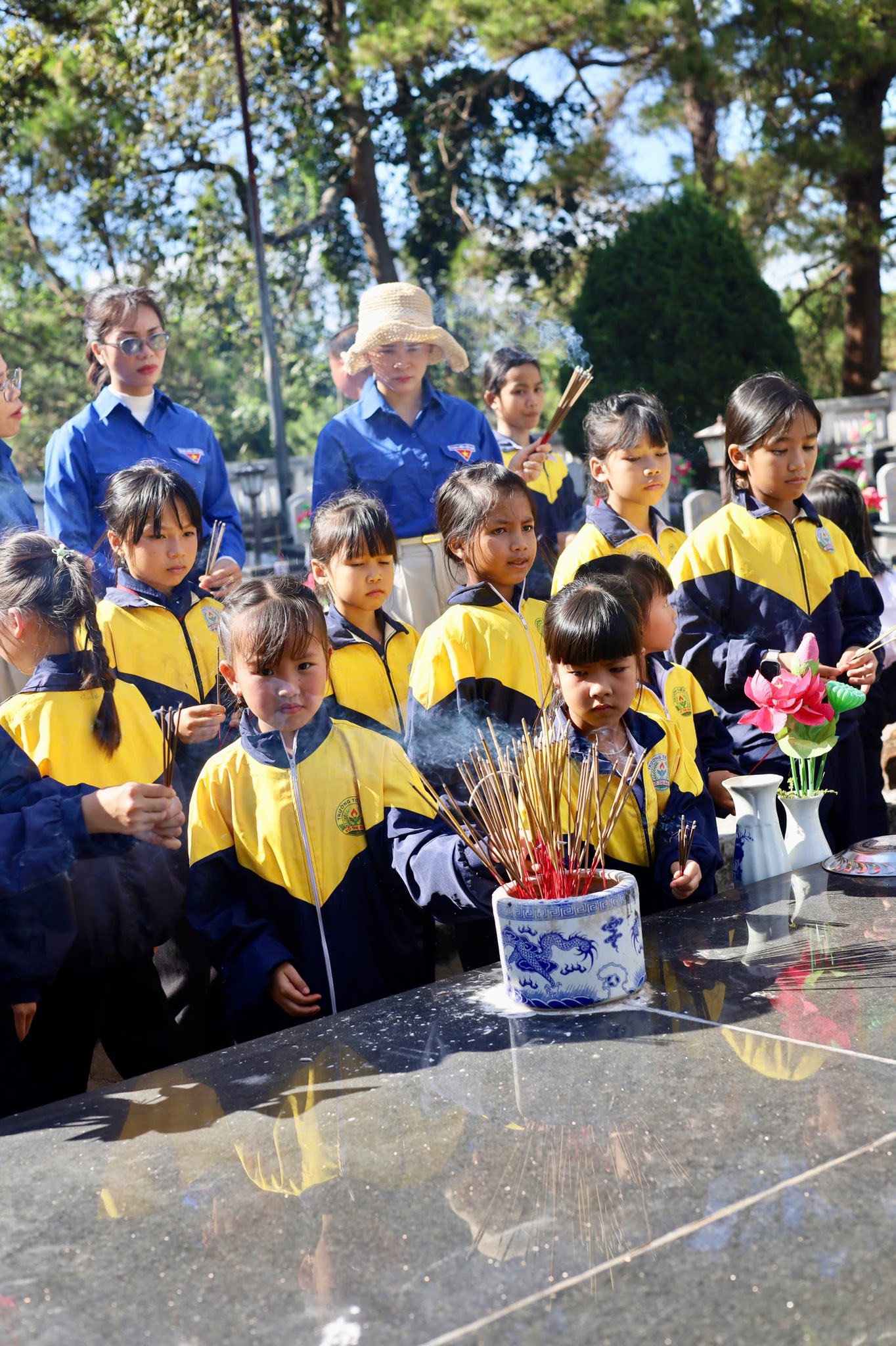 Trong không gian trang nghiêm, thầy và trò nhà trường đã thành kính dâng hương, dành phút mặc niệm tưởng nhớ những người con ưu tú của dân tộc đã anh dũng hy sinh vì độc lập, tự do của Tổ quốc. Đây là bài học sâu sắc về đạo lý “Uống nước nhớ nguồn”, hun đúc lòng biết ơn trong trái tim non trẻ của các em.